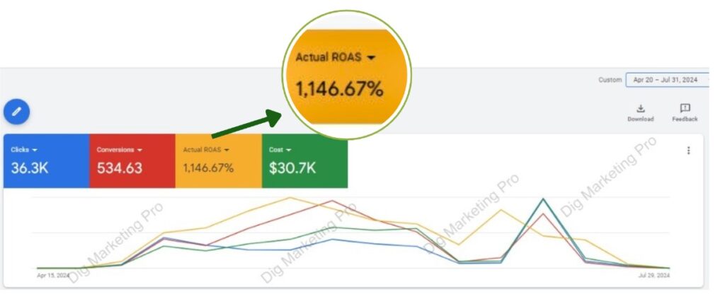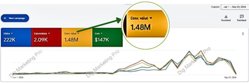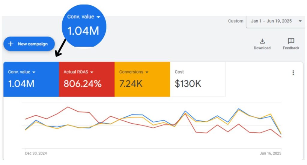 Since taking control of this account in March 2024, I have driven remarkable growth. The campaign achieved 2.09K conversions, and a $1.48M conversion value on a $136K spend with maintain a ROAS of 1000%.